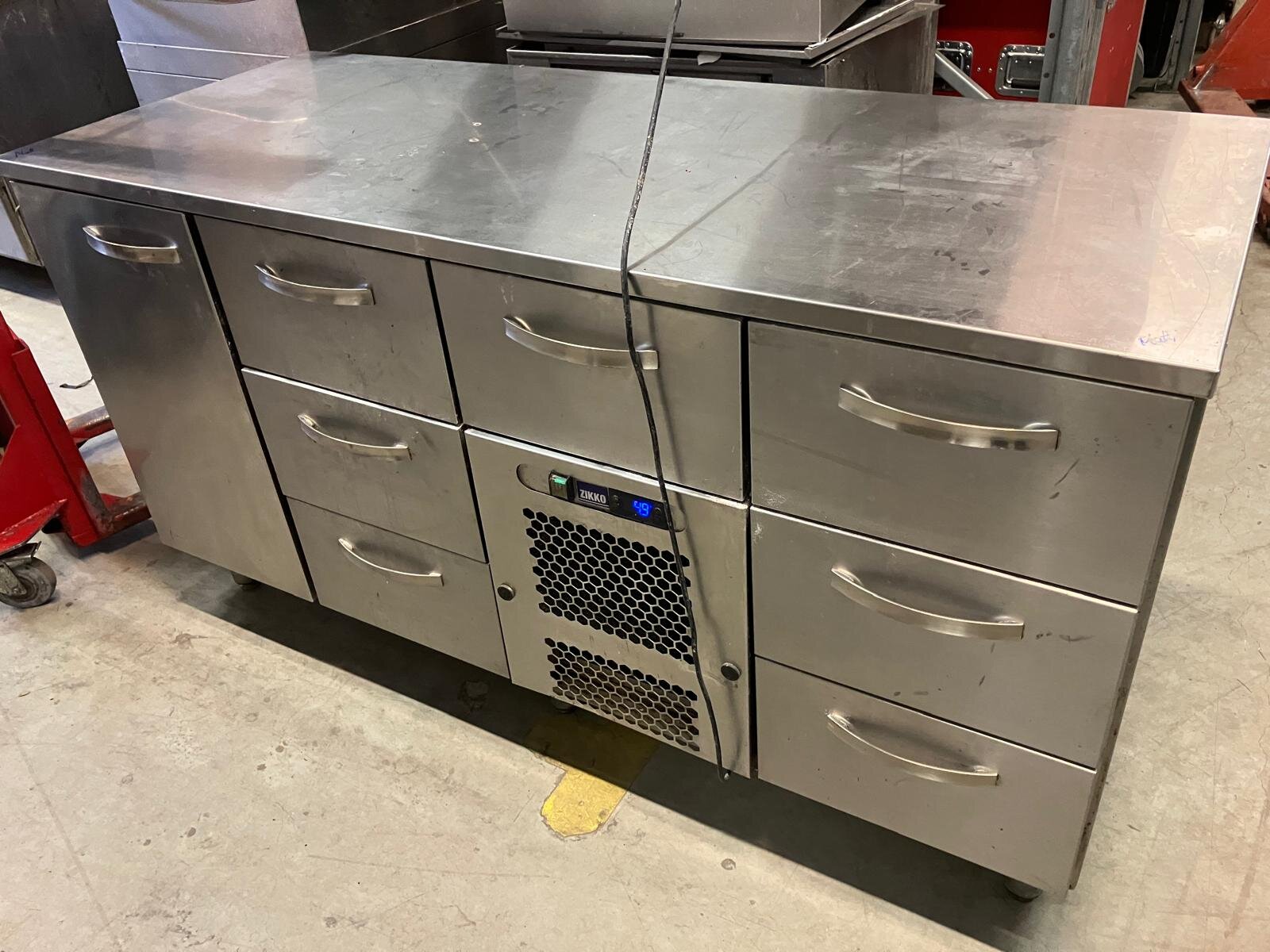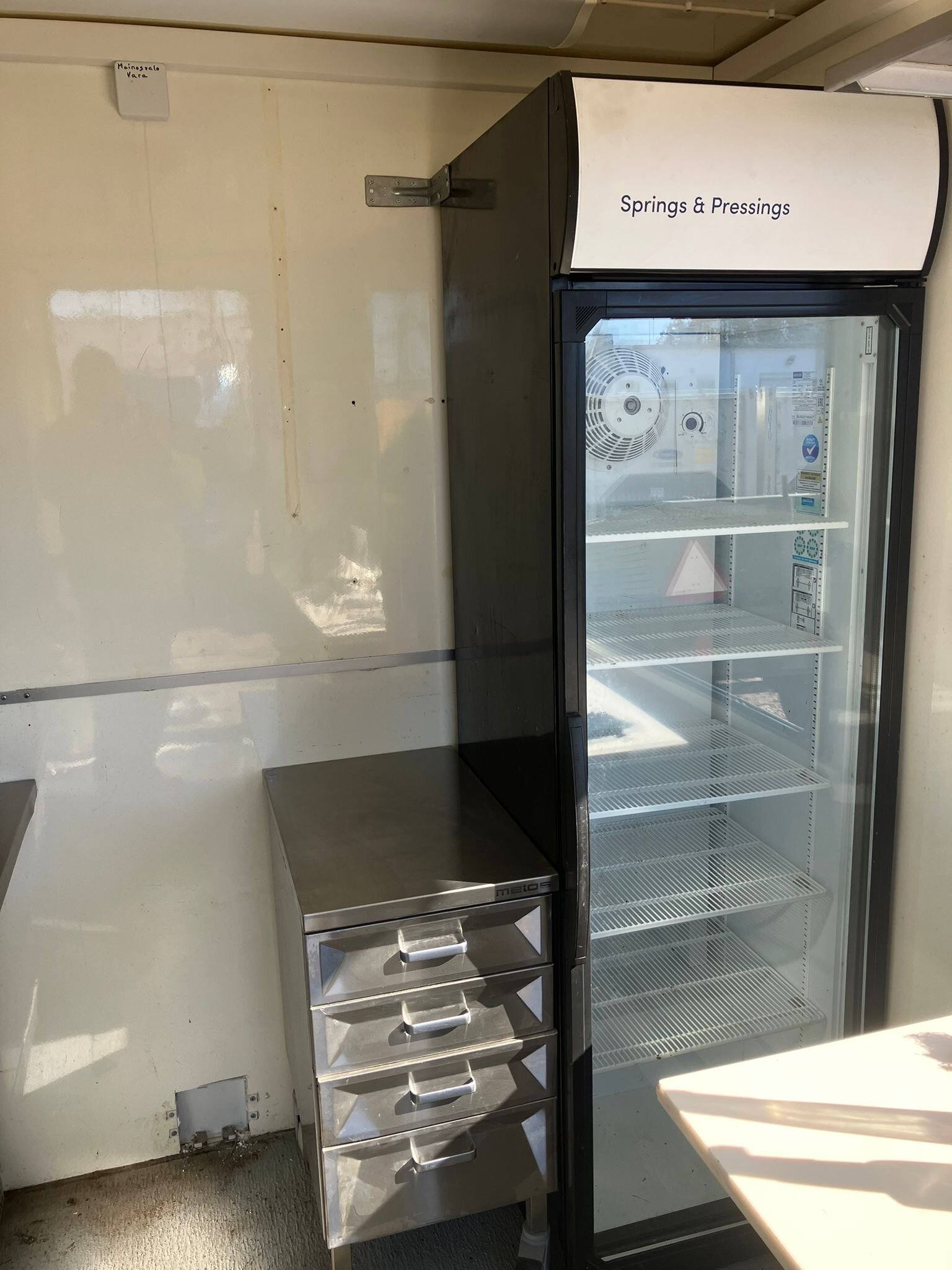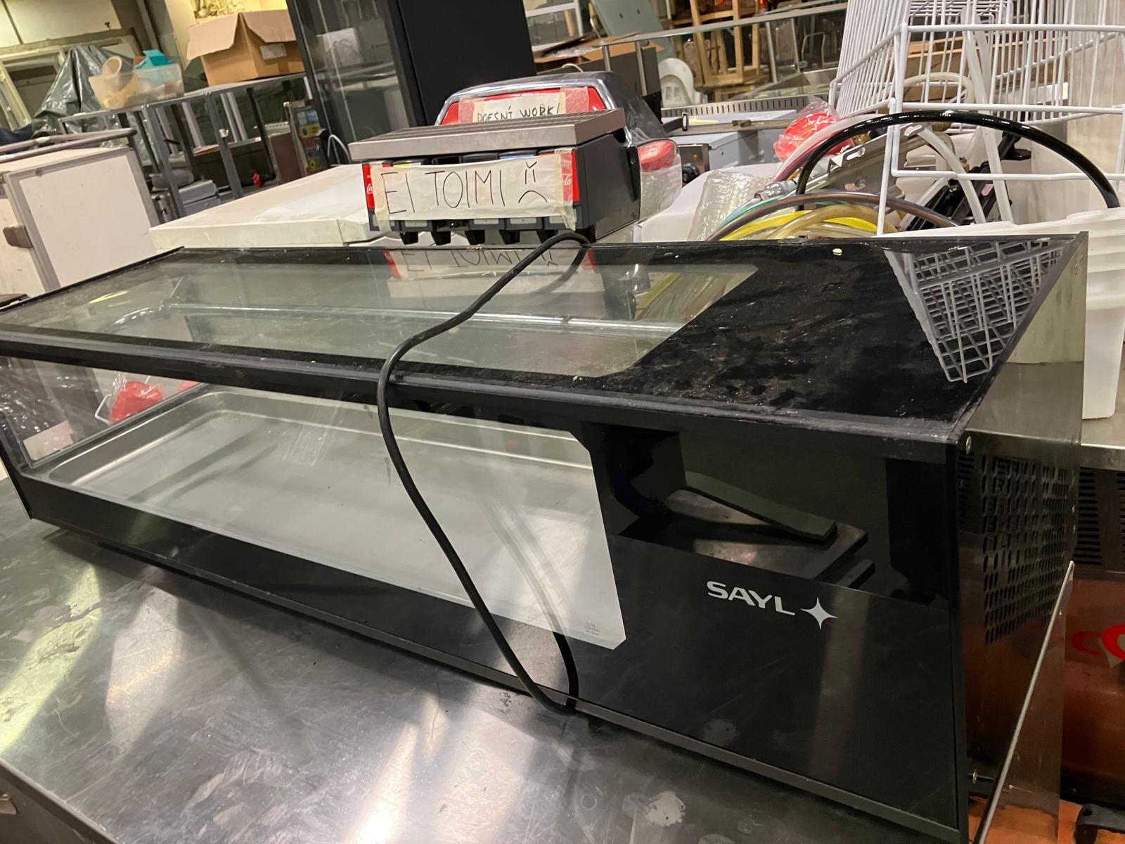 pakastin, juomakaappi 180 cm teräslaatikosto 40 cm, rasvakeitin, kaasuhella 2.lla polttimella, kiertoilmauuni, teräshyllyt