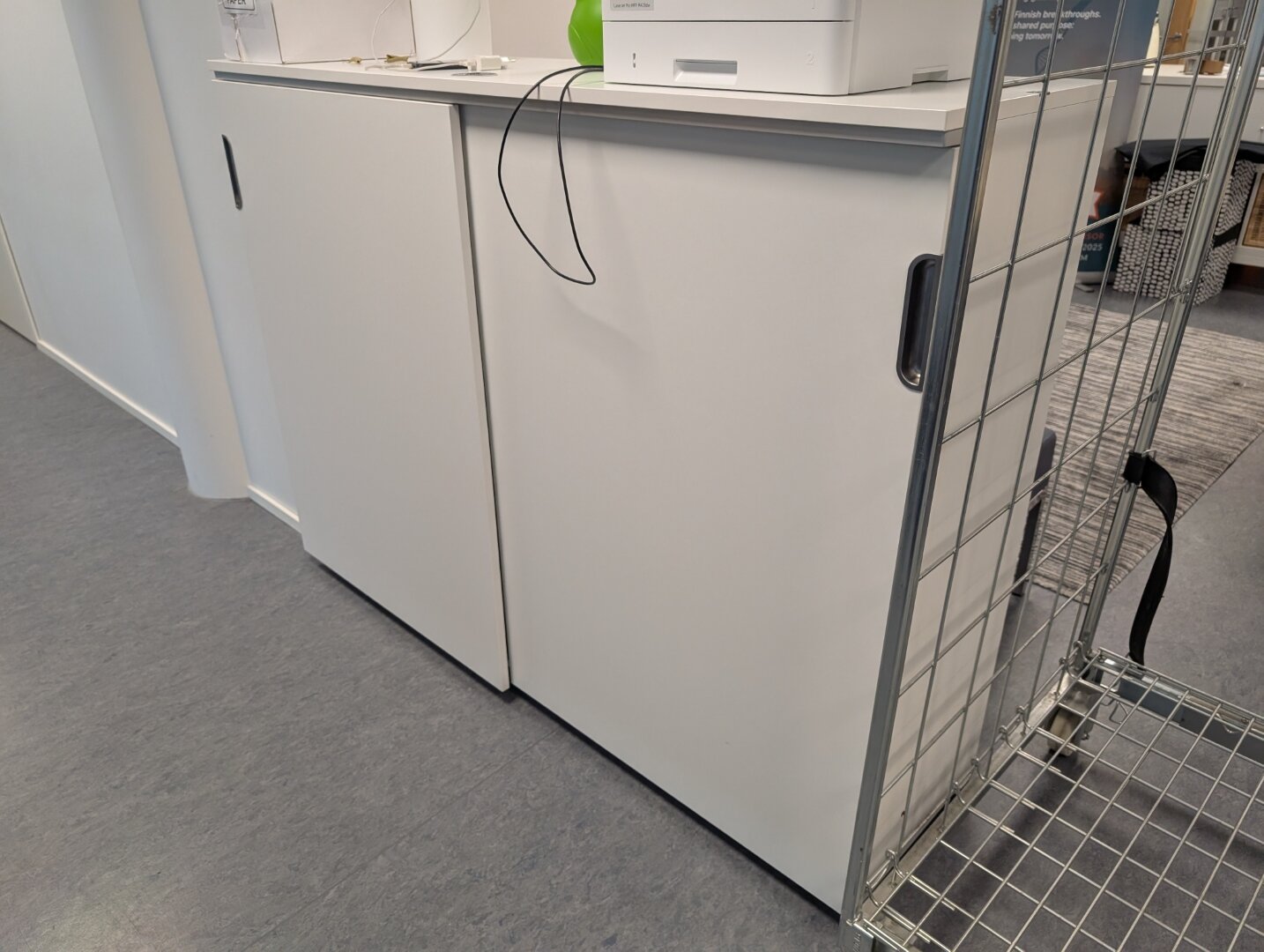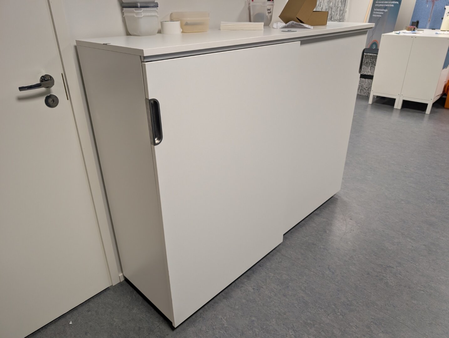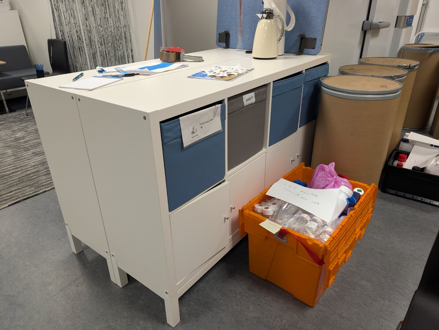 3 kpl mappikaappeja, 2 kpl Kallax kaappeja ja aulan kalusteet