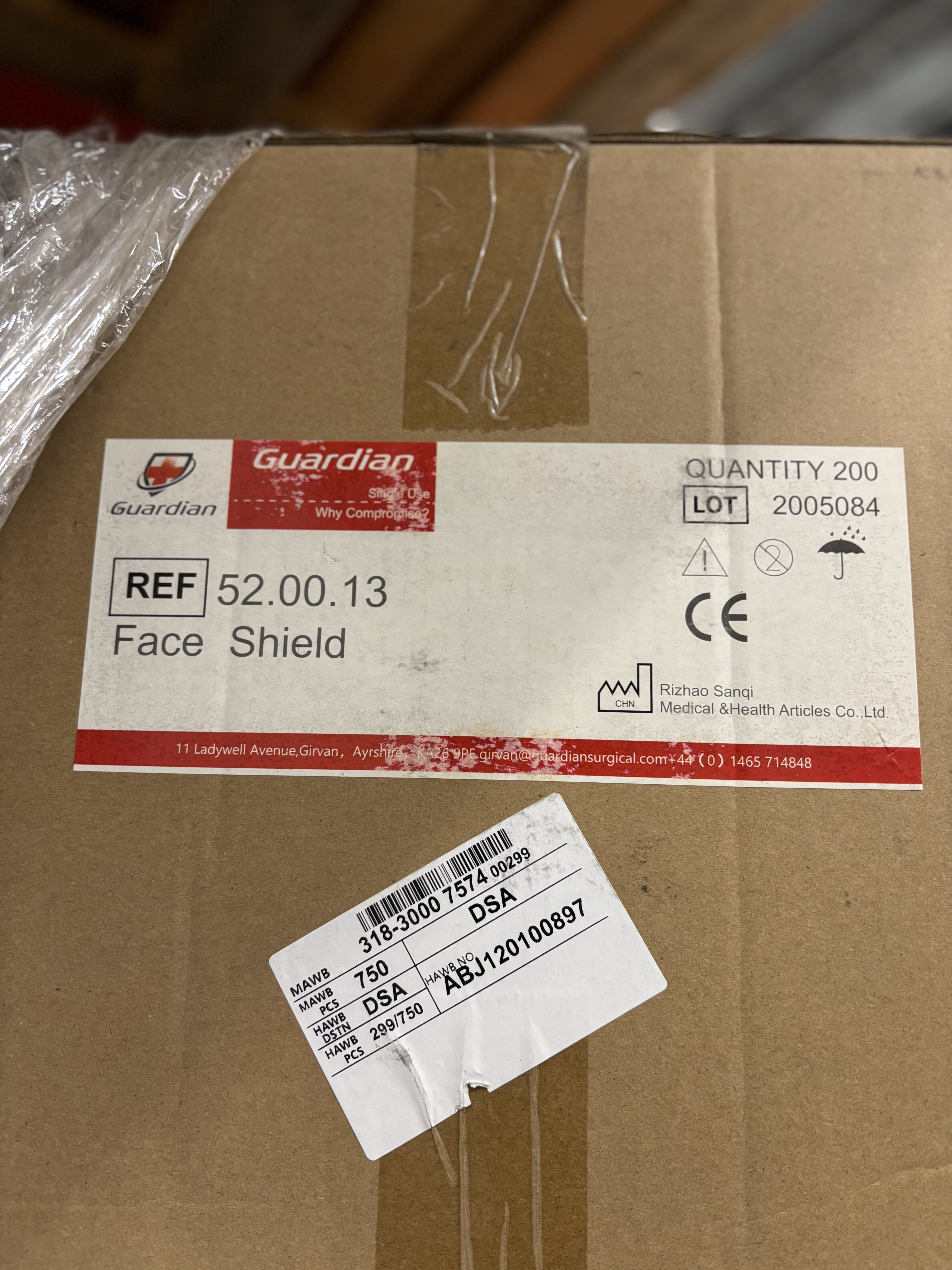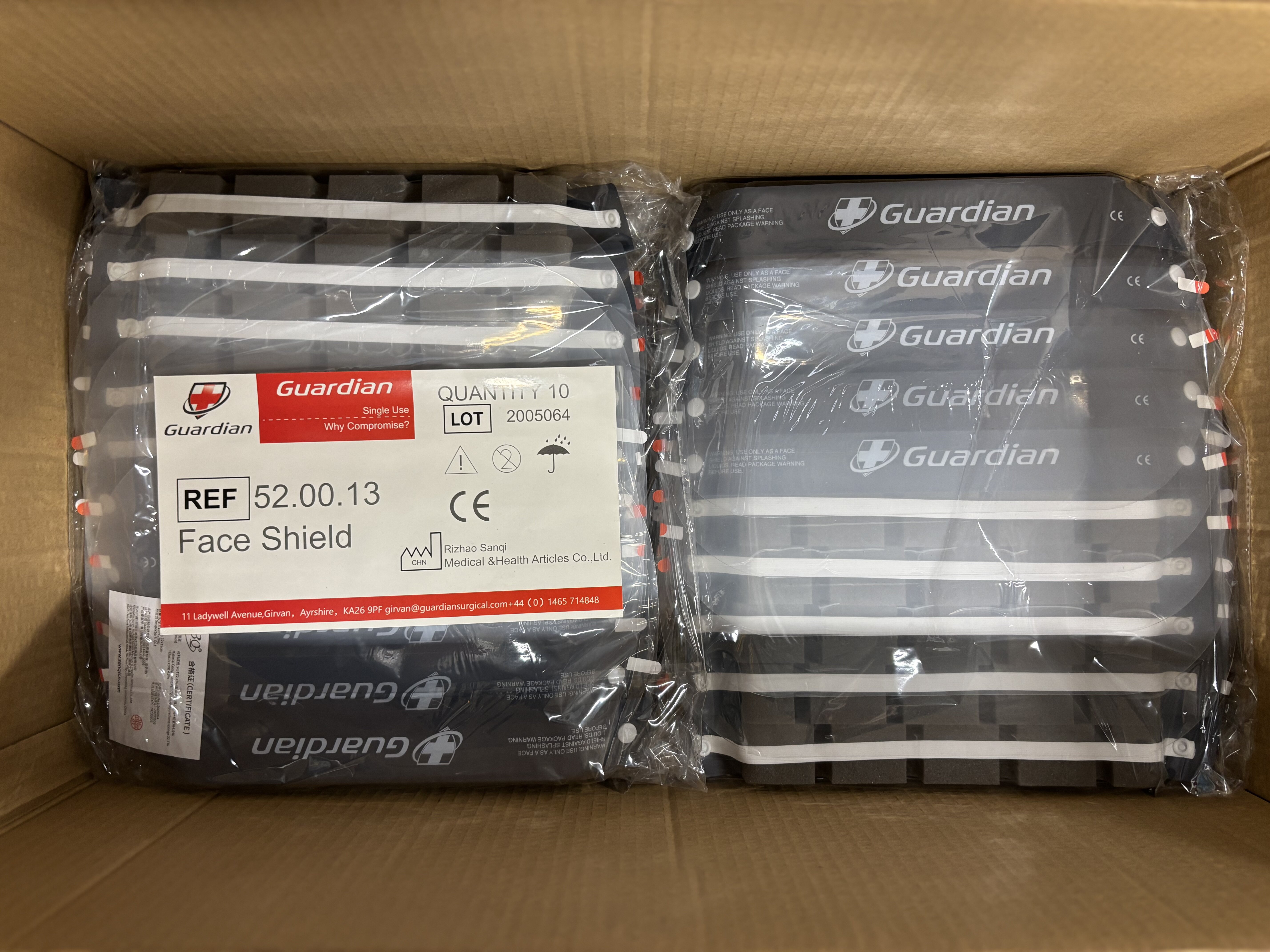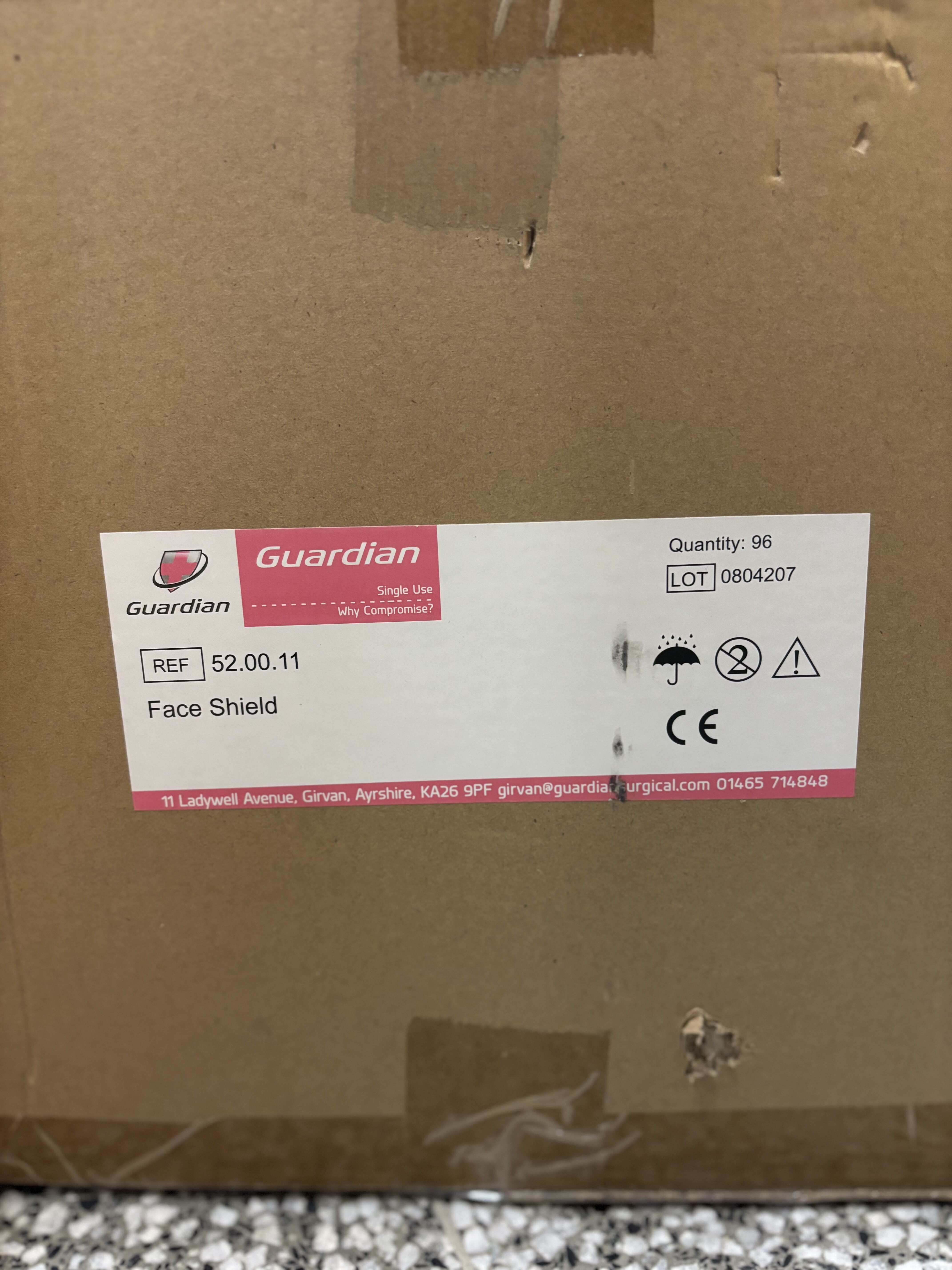Guardian Face Shield 52.00.11, 52.00.13. 17 laatikkoa sisältää yhteensä yli 1700 kpl suojavisiirejä.